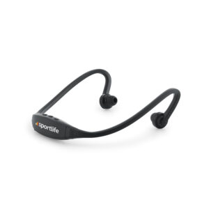 Fone de ouvido desportivo em ABS e silicone com transmissão sem fios BT v4.0. Autonomia aproximada de 3 h. Função para atender chamadas e conexão à playlist do dispositivo móvel. Incluso cabo micro USB para carregar. Fornecido com bolsa em non-woven