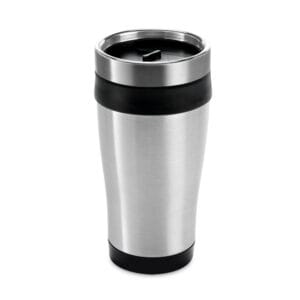 Copo de viagem em aço inox e PP, térmico com parede dupla isolada a ar. A tampa possui sistema de abertura e fecho fácil. Capacidade até 420 mL. Preserva as bebidas quentes por 2h e frias por 4h. Fornecido em caixa presente. Certificação EU Food Grade