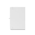 Caderno A5 de capa dura, ideal para personalização em sublimação. O caderno em poliéster 100% reciclado (rPET) 300D tem 160 páginas pautadas em papel 100% reciclado cor de marfim, uma fita separadora, um suporte para esferográfica (não inclusa) e um elástico para fecho do bloco. 143 x 211 mm