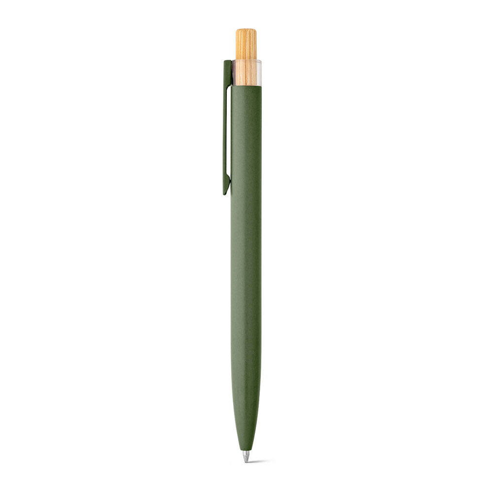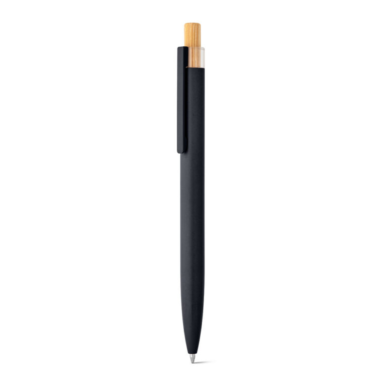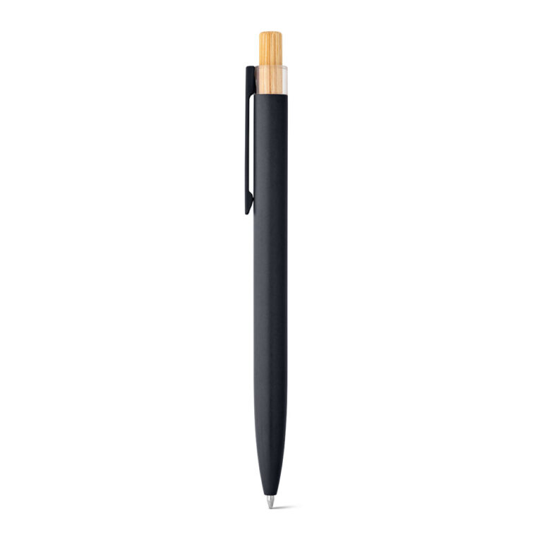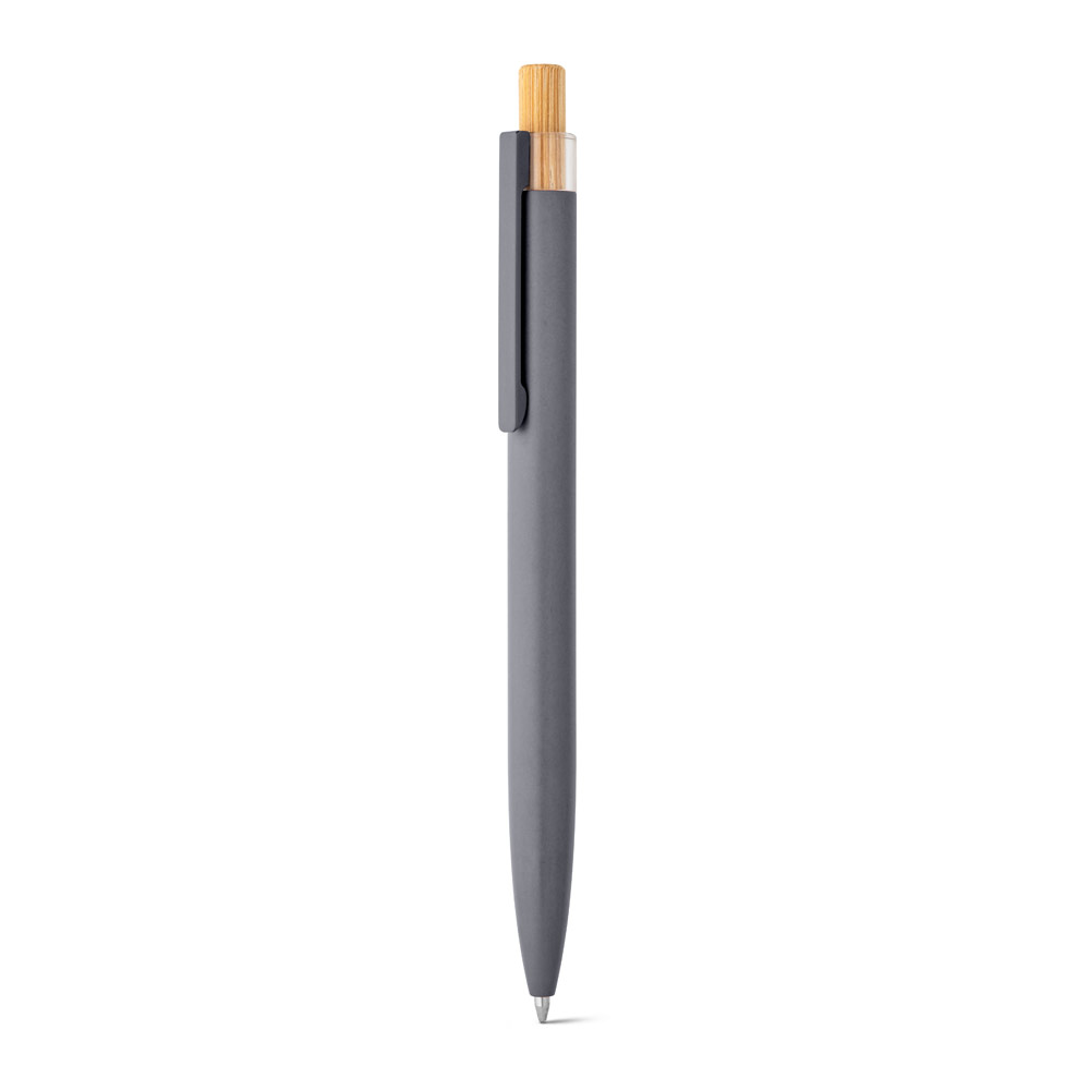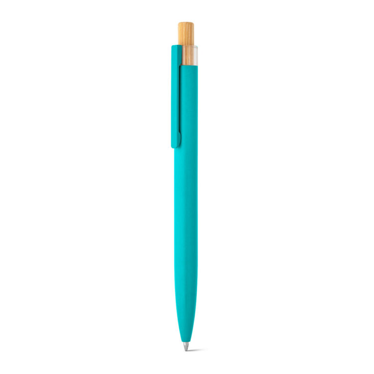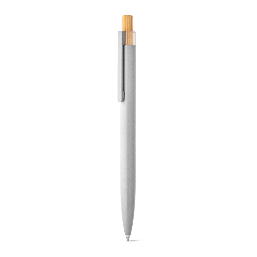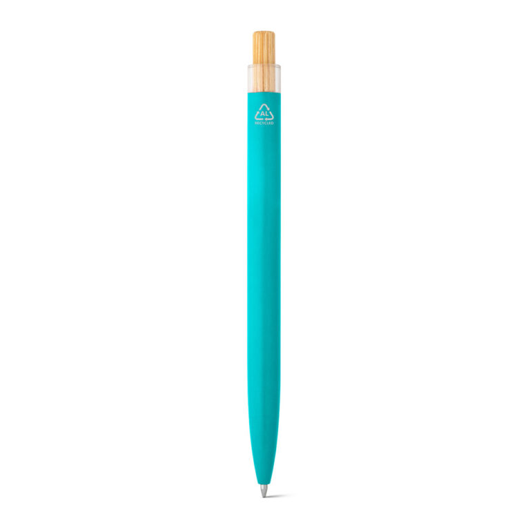 Esferográfica com corpo em alumínio 100% reciclado, topo em Pet 100% reciclado, botão em bambu e clipe de metal. Escrita em azul até 1,5 km. A cor e o resultado da impressão nos materiais naturais pode variar entre produtos