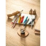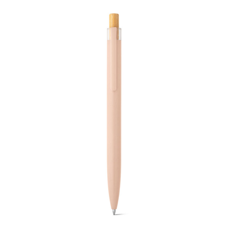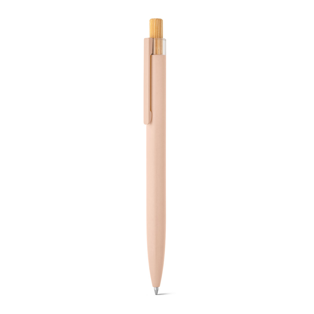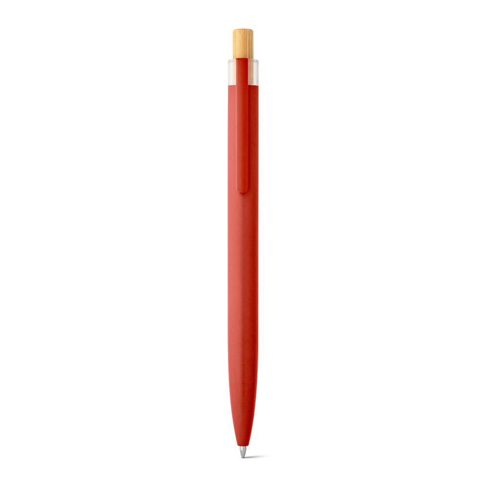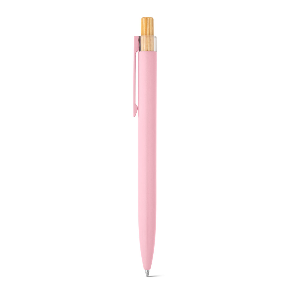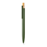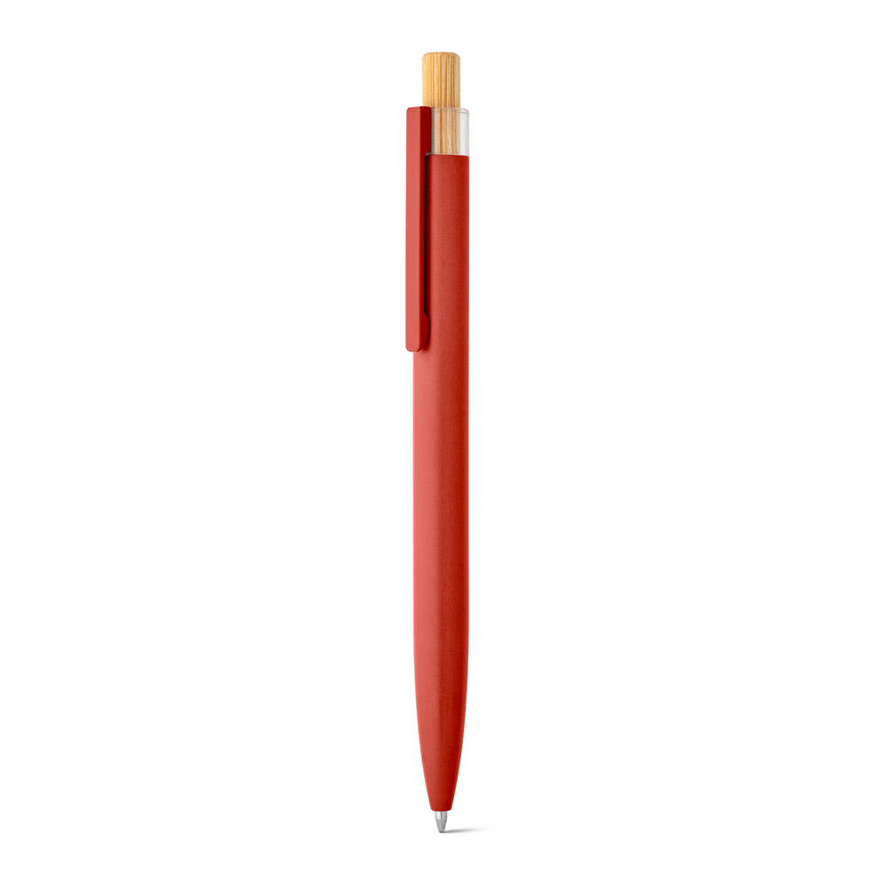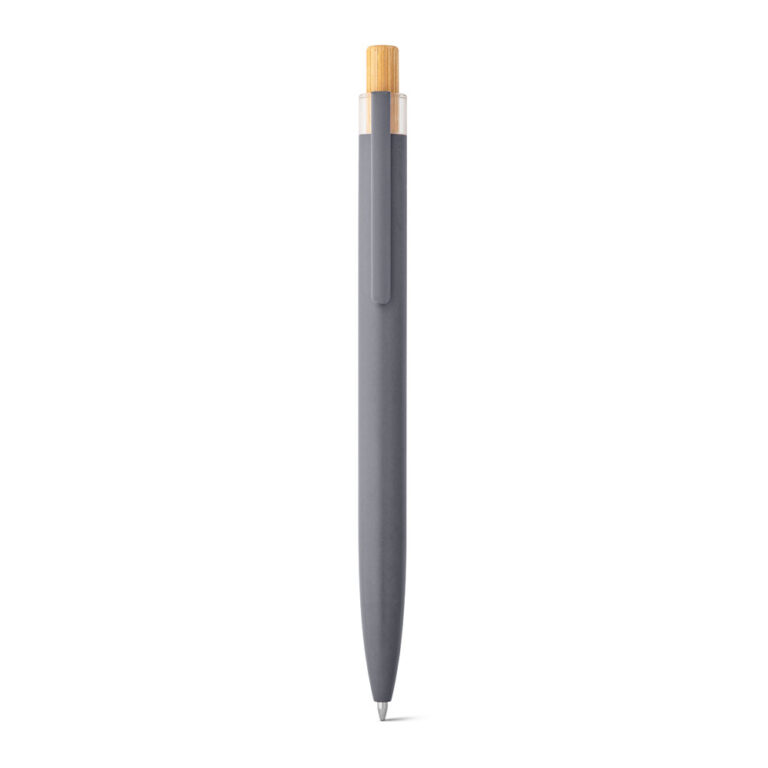 Esferográfica com corpo em alumínio 100% reciclado, topo em Pet 100% reciclado, botão em bambu e clipe de metal. Escrita em azul até 1,5 km. A cor e o resultado da impressão nos materiais naturais pode variar entre produtos