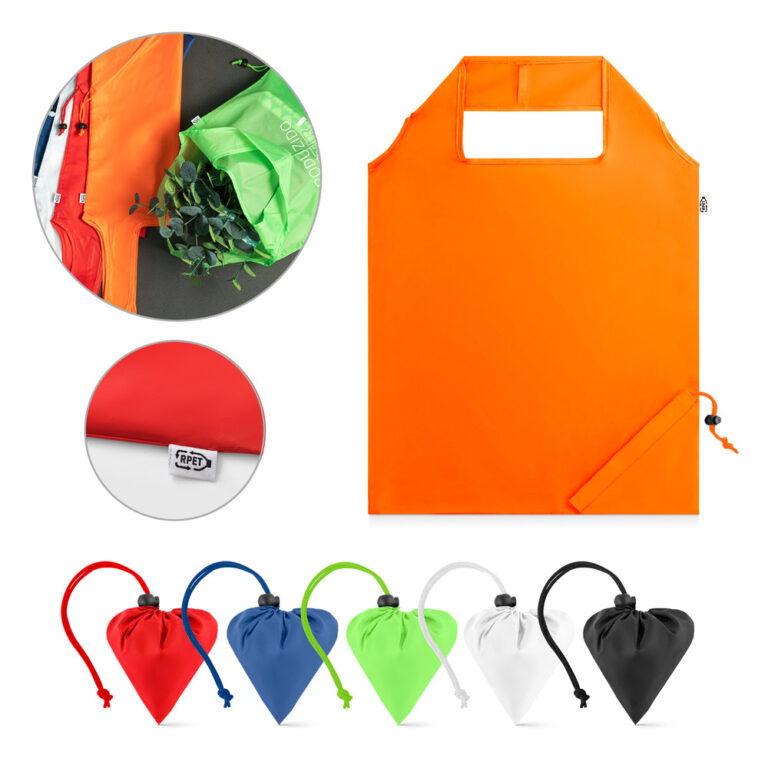 Sacola dobrável em poliéster reciclado 190T, com alças de 40 cm. Produzida a partir de plástico reciclado contribuindo para a redução dos resíduos no meio ambiente