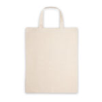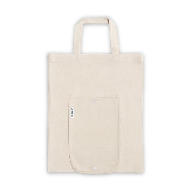 Sacola dobrável em 50% algodão, 30% algodão reciclado e 20% poliéster reciclado (140 g/m²), com alças de 38 cm. Aberto: 380 x 470 mm | Dobrado: 135 x 205 mm