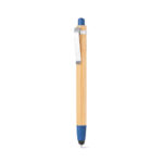 Esferográfica em bambu com ponteira touch e clipe de metal. Os elementos coloridos são em fibra de trigo e ABS. Escrita em azul até 1,5 km. A cor e o resultado da impressão nos materiais naturais pode variar entre produtos