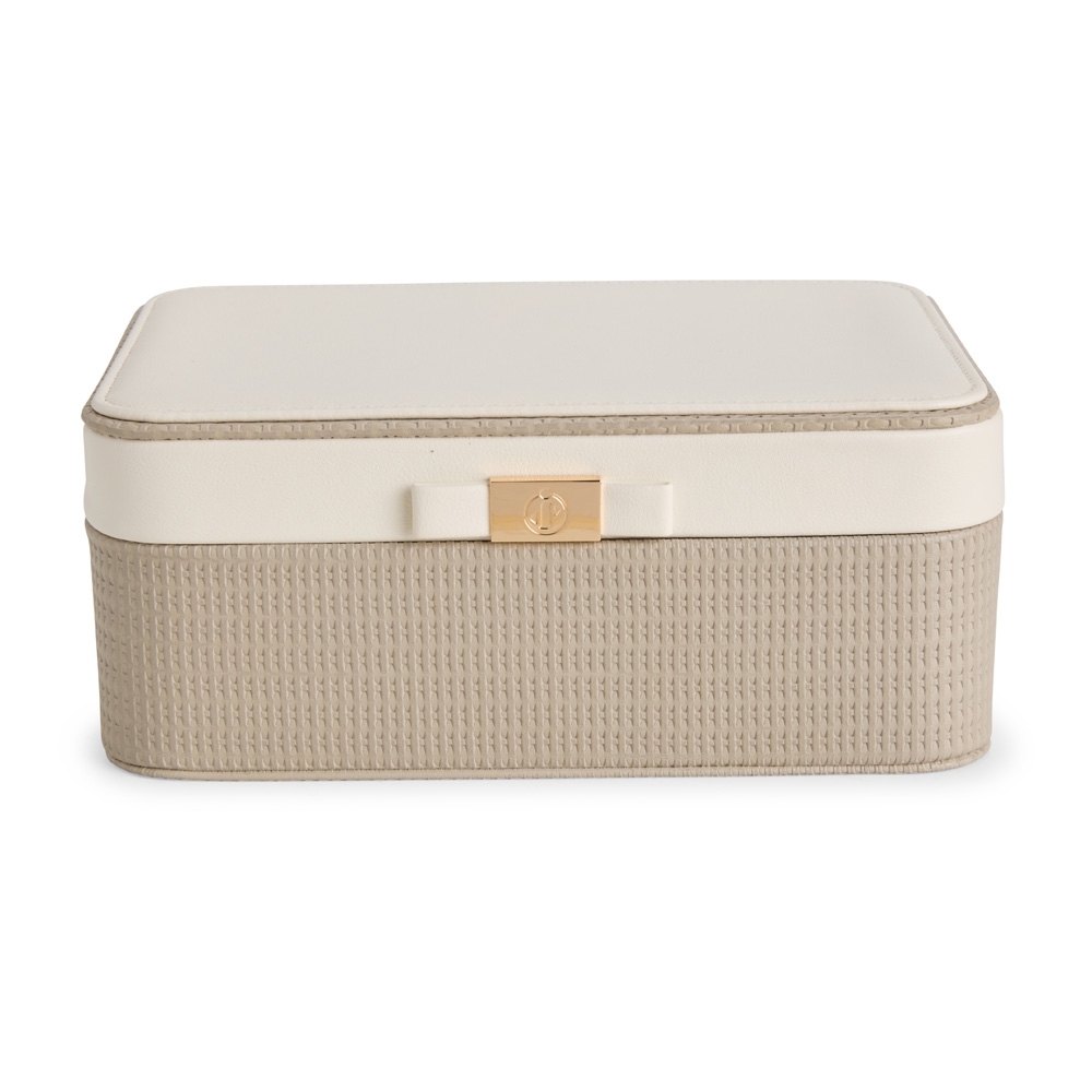 Descrição: Porta-joias em couro sintético texturizado, com detalhe frontal em metal e revestimento interno em veludo. No interior da tampa, apresenta quatro ganchos, um bolso com elástico e um espelho de formato retangular. Possui dois compartimentos principais: o superior, removível, com 12 divisórias em diferentes tamanhos, que também inclui uma tampa protetora para as divisórias centrais; e o inferior, com divisórias removíveis e duas almofadas.