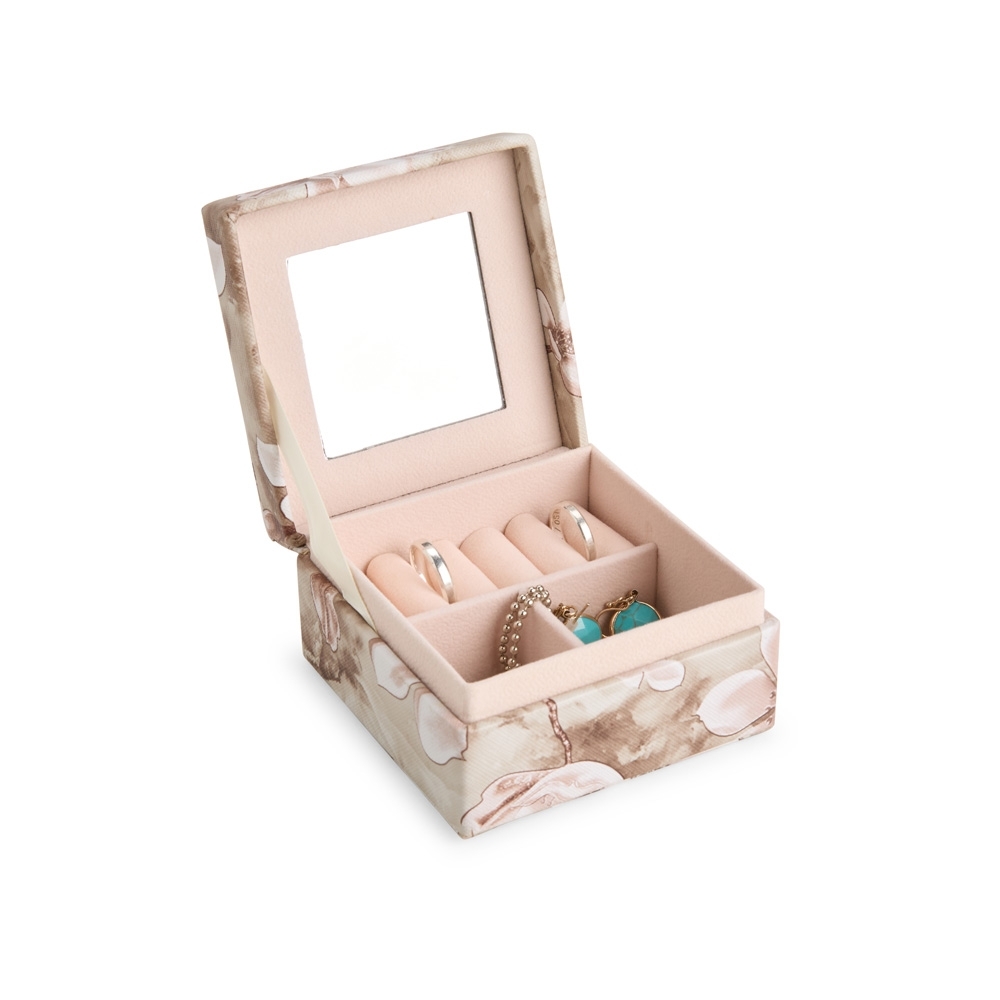 Descrição: Porta-joias em couro sintético levemente texturizado e revestimento interno em veludo. Conta com espelho fixo no interior da tampa e um compartimento com três divisórias, uma delas com almofadas para anéis e brincos.
