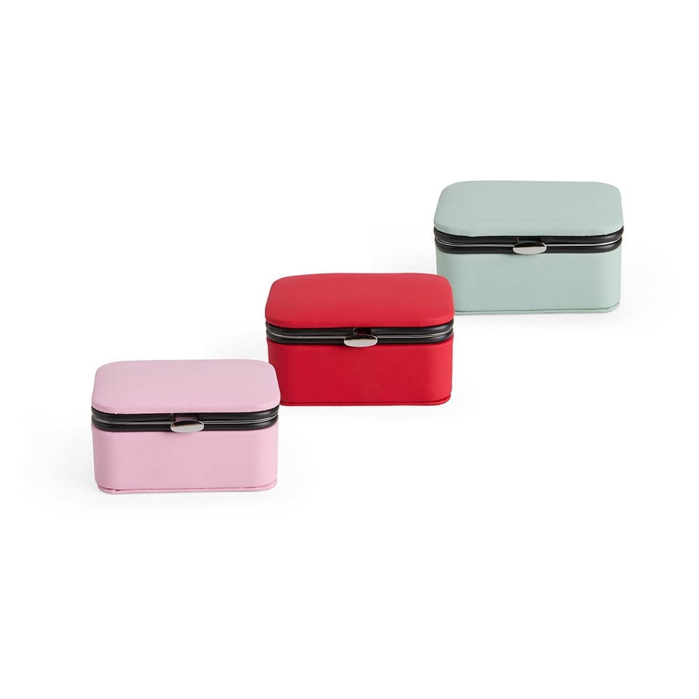 Descrição: Porta-joias em couro sintético, com mecanismo de fechamento acionado por botão e revestimento interno aveludado. Possui espelho na parte interna da tampa e dois compartimentos principais, um deles almofadado para anéis e brincos.