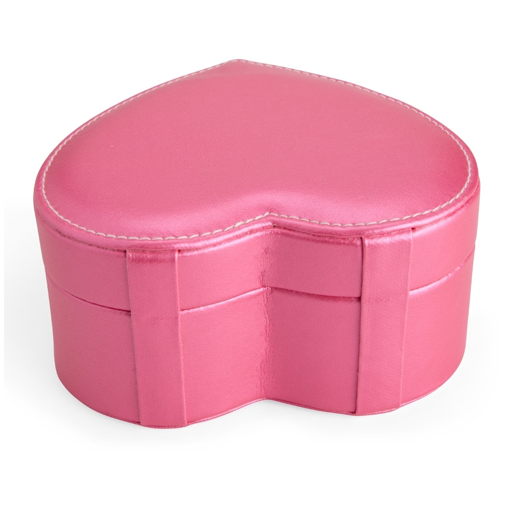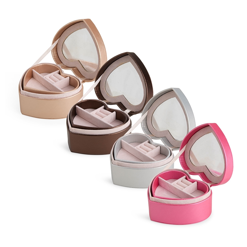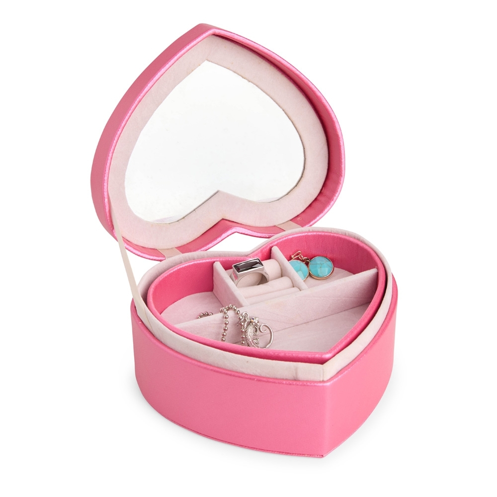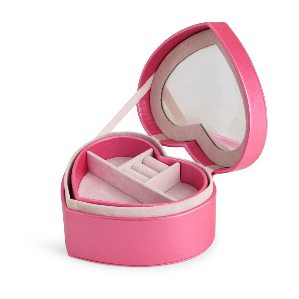 Descrição: Porta-joias em couro sintético com formato de coração e revestimento interno aveludado. Conta com espelho interno e dois compartimentos principais: o superior, removível, com quatro divisórias em diferentes tamanhos, uma delas com almofadas para abrigar anéis e brincos; e o inferior, com mais quatro divisórias.