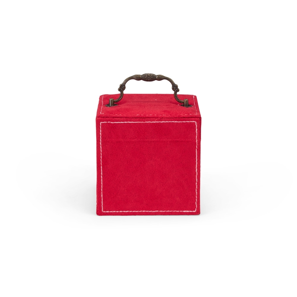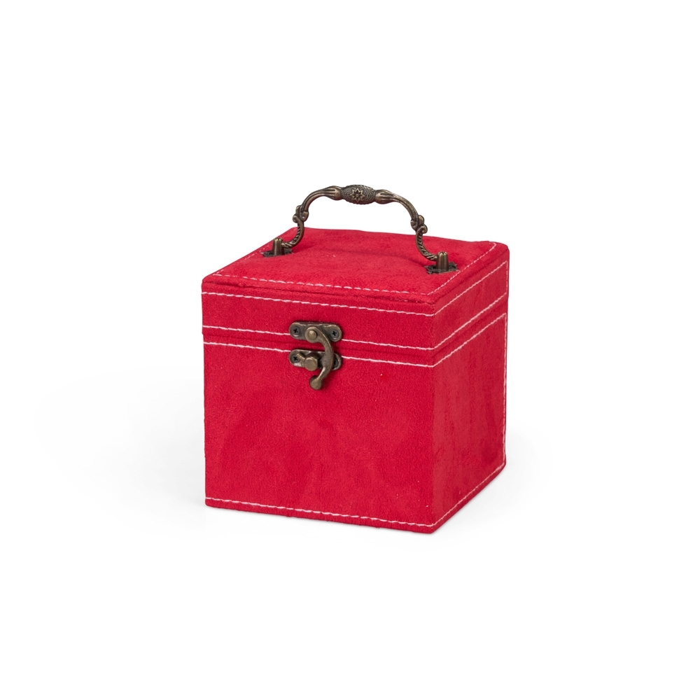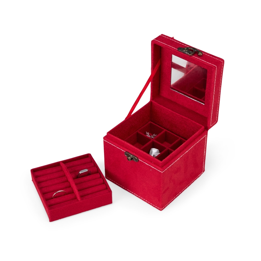 Descrição: Porta-joias de revestimento aveludado com estrutura em MDF, alça e trava de fechamento em metal. Conta com espelho na parte interna da tampa e três compartimentos removíveis, cada um com divisórias de tamanhos variados para melhor organização de objetos. Altura : 12 cm Largura : 12 cm Profundidade : 12 cm Medidas aproximadas para gravação (CxL): 6 cm