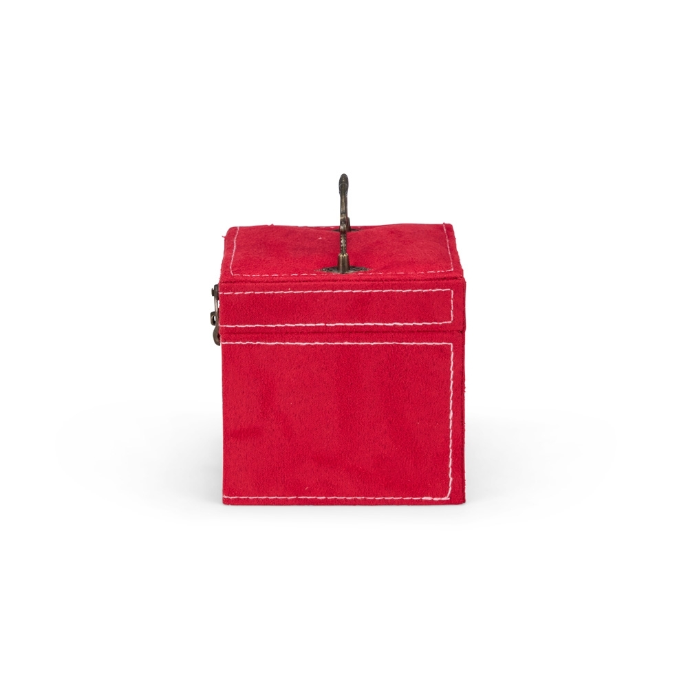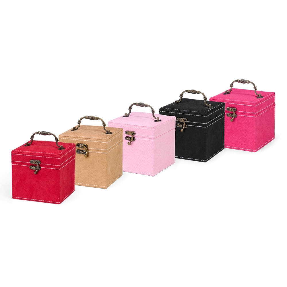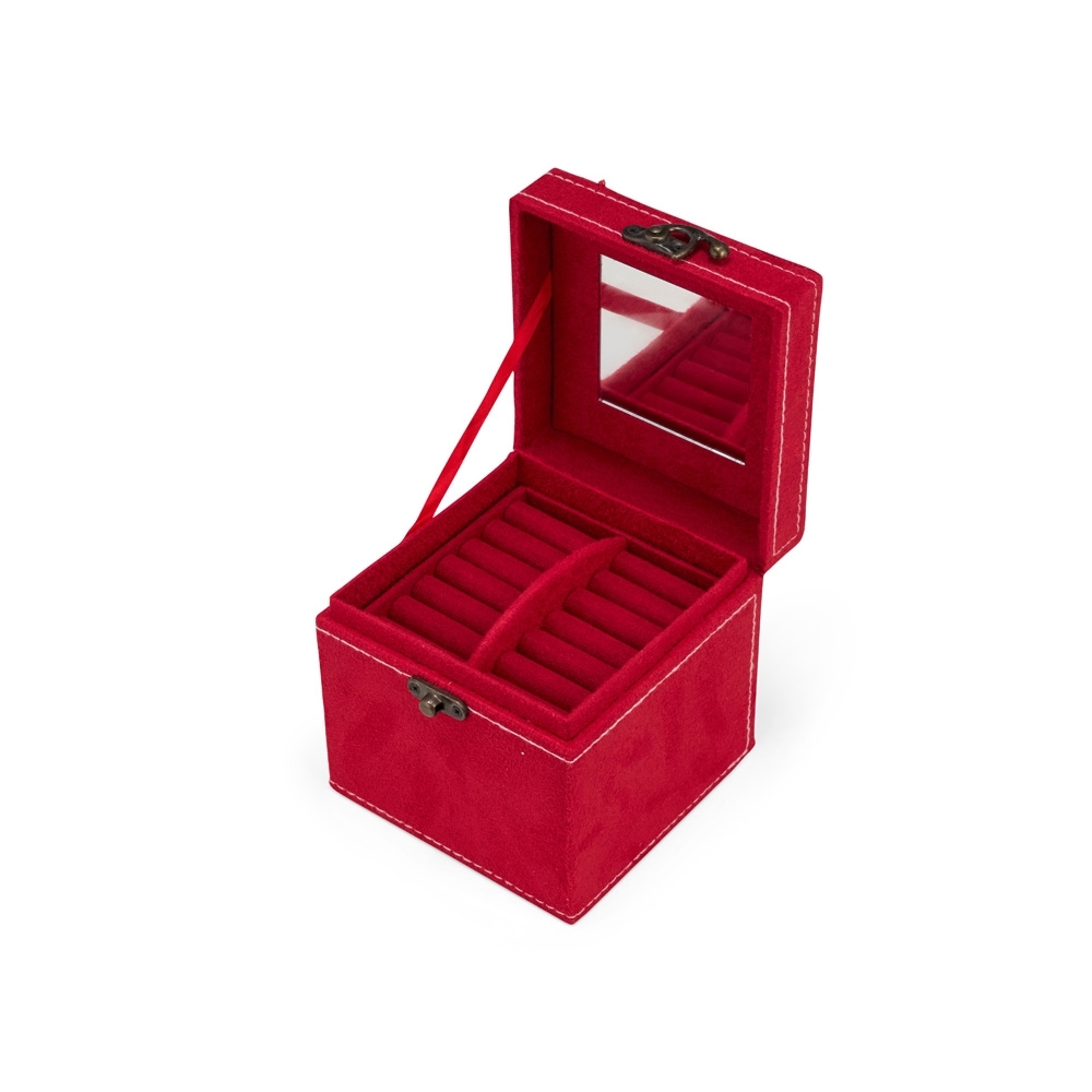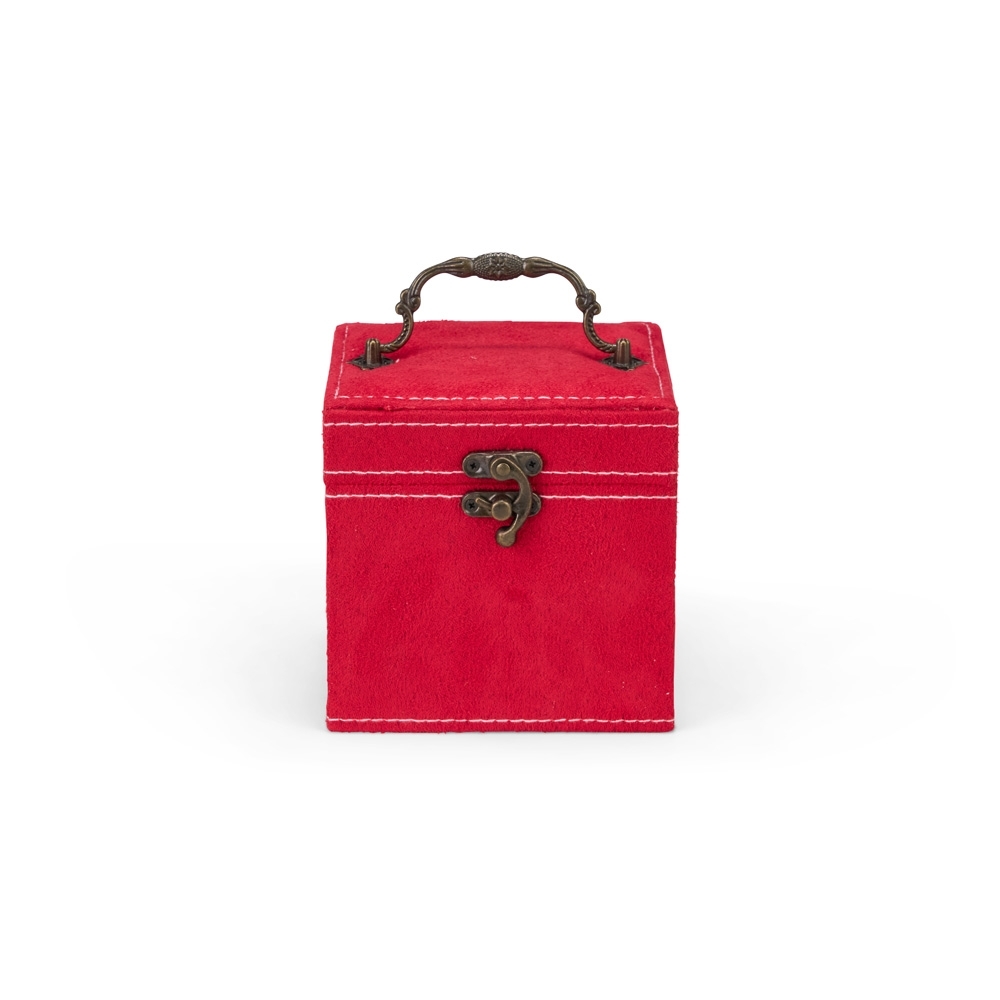 Descrição: Porta-joias de revestimento aveludado com estrutura em MDF, alça e trava de fechamento em metal. Conta com espelho na parte interna da tampa e três compartimentos removíveis, cada um com divisórias de tamanhos variados para melhor organização de objetos. Altura : 12 cm Largura : 12 cm Profundidade : 12 cm Medidas aproximadas para gravação (CxL): 6 cm