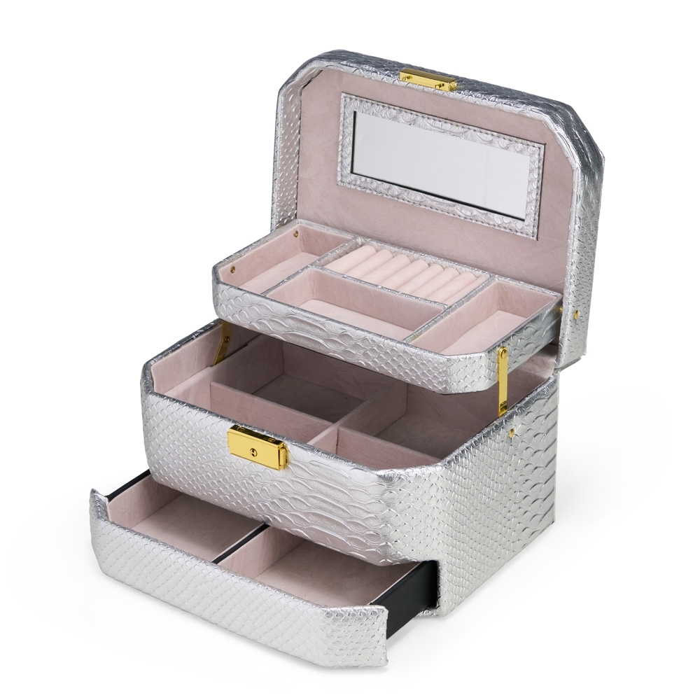 Descrição: Maleta porta-joias em couro sintético com textura crocodilo, espelho interno e trava de fechamento. Possui sistema de abertura articulado que posiciona os três compartimentos principais em formato de escada, facilitando a organização dos objetos nas divisórias de revestimento aveludado.