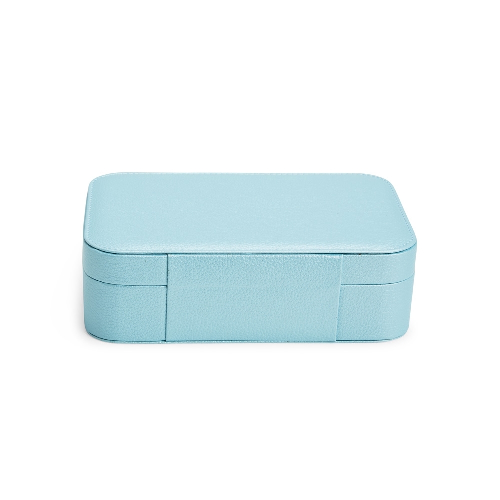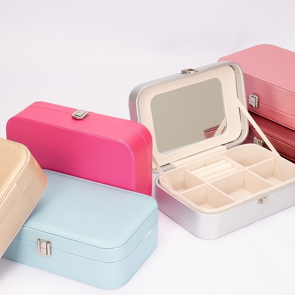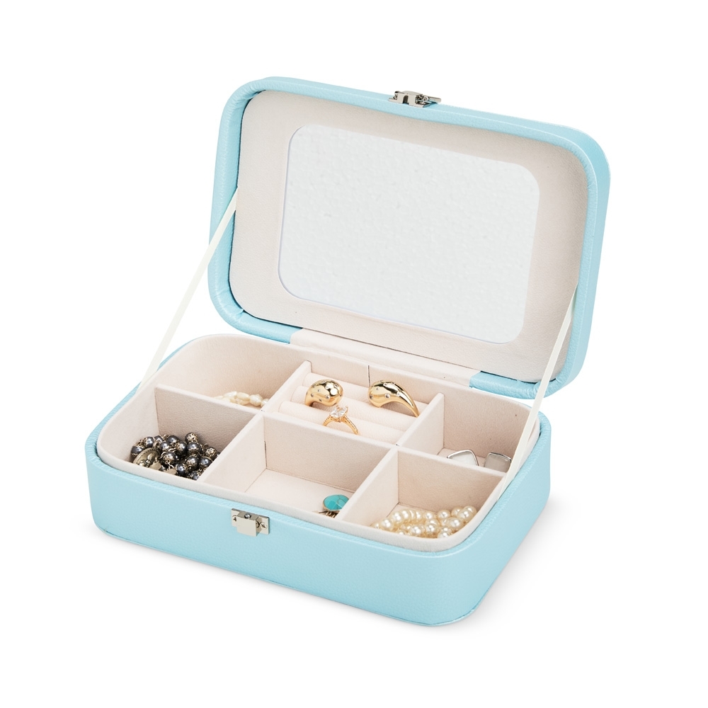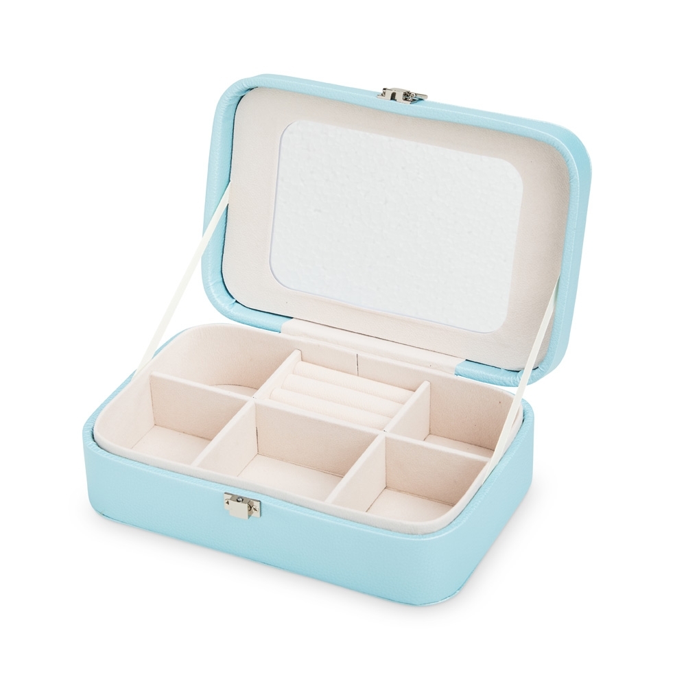 Descrição: Porta-joias em poliuretano (PU) e revestimento interno aveludado. Apresenta, em seu interior, um espelho fixo e mais seis divisórias, incluindo uma repartição almofadada com ranhuras para guardar anéis. Além disso, o estojo possui trava de segurança para fechamento.
