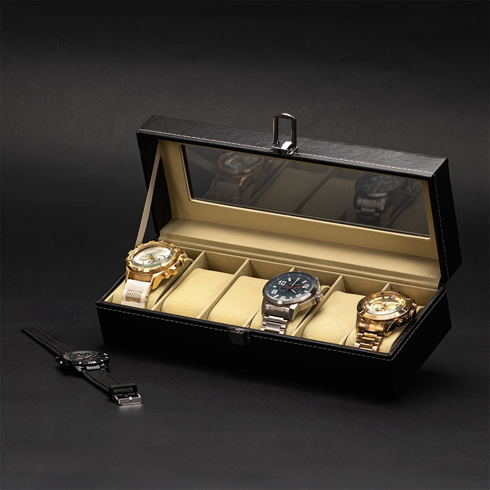 Descrição: Porta-relógios com acabamento em couro sintético à base de PVC e revestimento interno em tecido aveludado. Dispõe de seis divisórias com almofadas removíveis, tampa com viseira de vidro e abertura em 90 graus, além de trava de segurança para o fechamento do estojo.