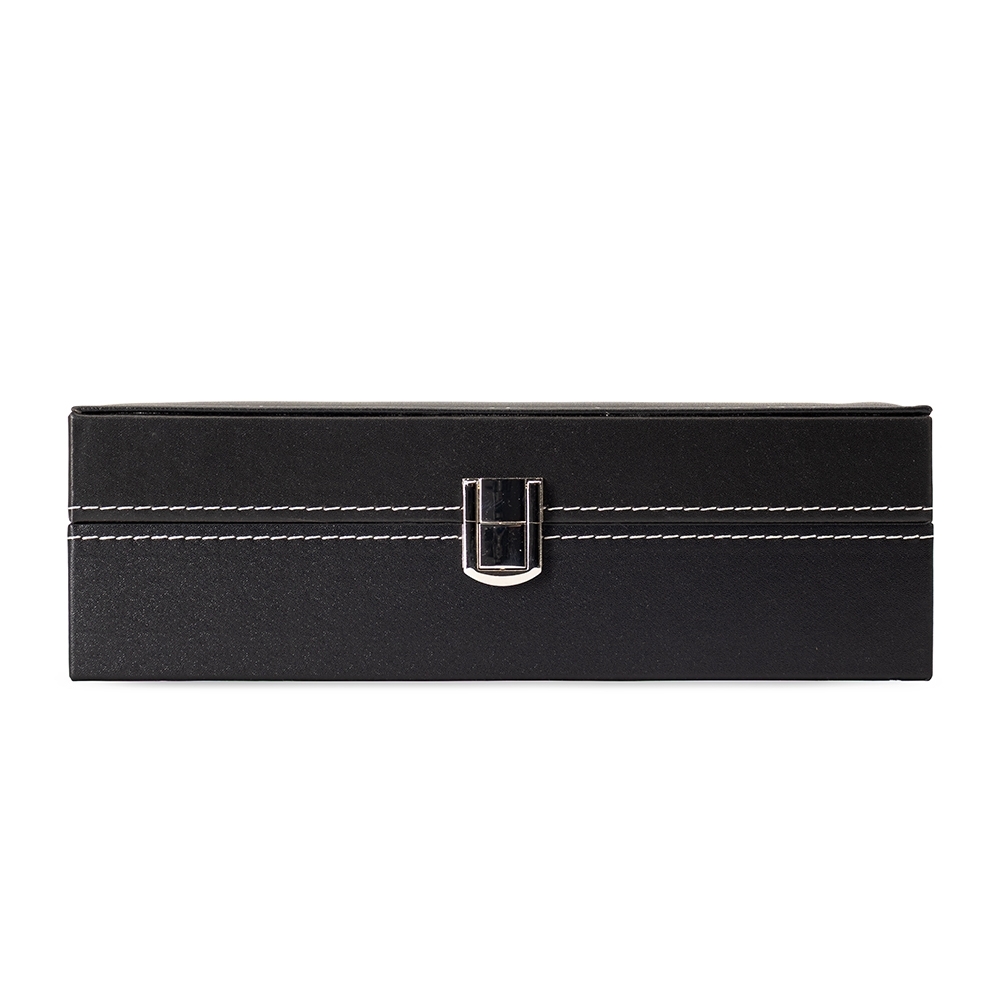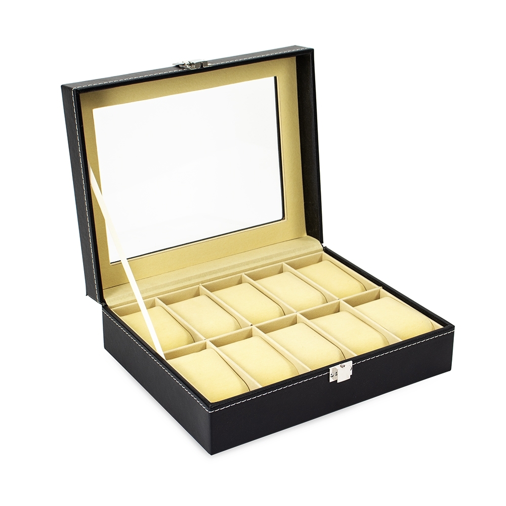 Descrição: Porta-relógios com acabamento em couro sintético à base de PVC e revestimento interno em veludo. Conta com 10 compartimentos fixos com almofadas removíveis em espuma, além de visor de vidro e trava de segurança para o fechamento do estojo.