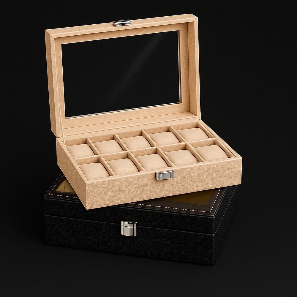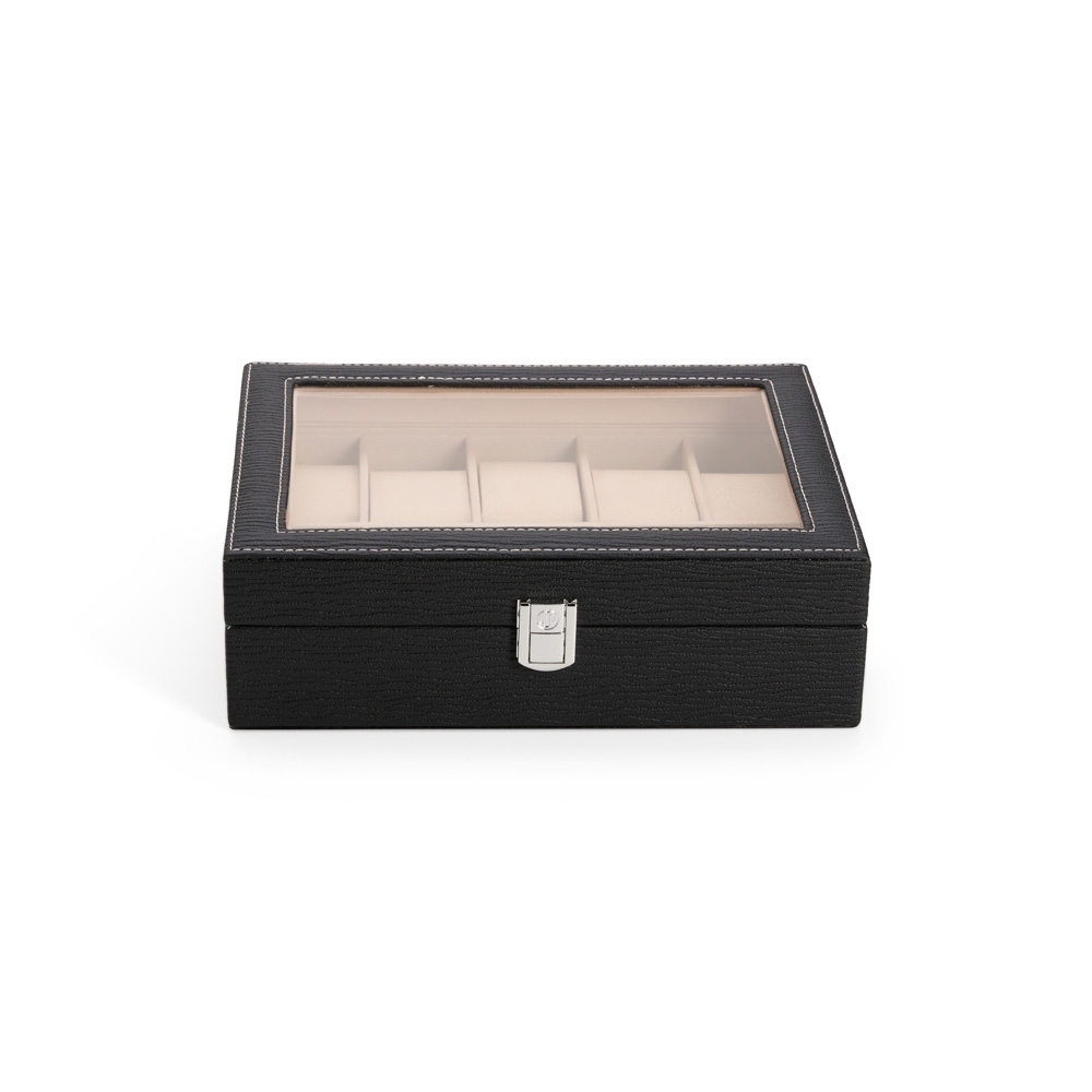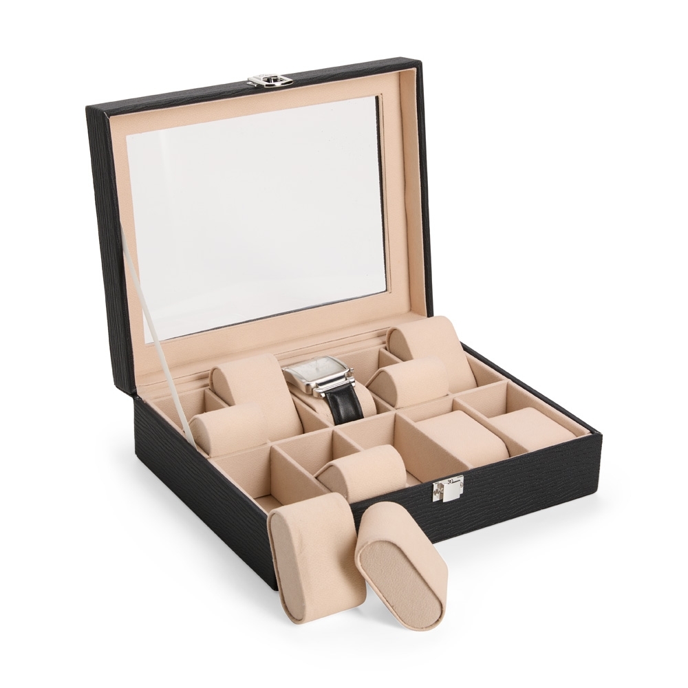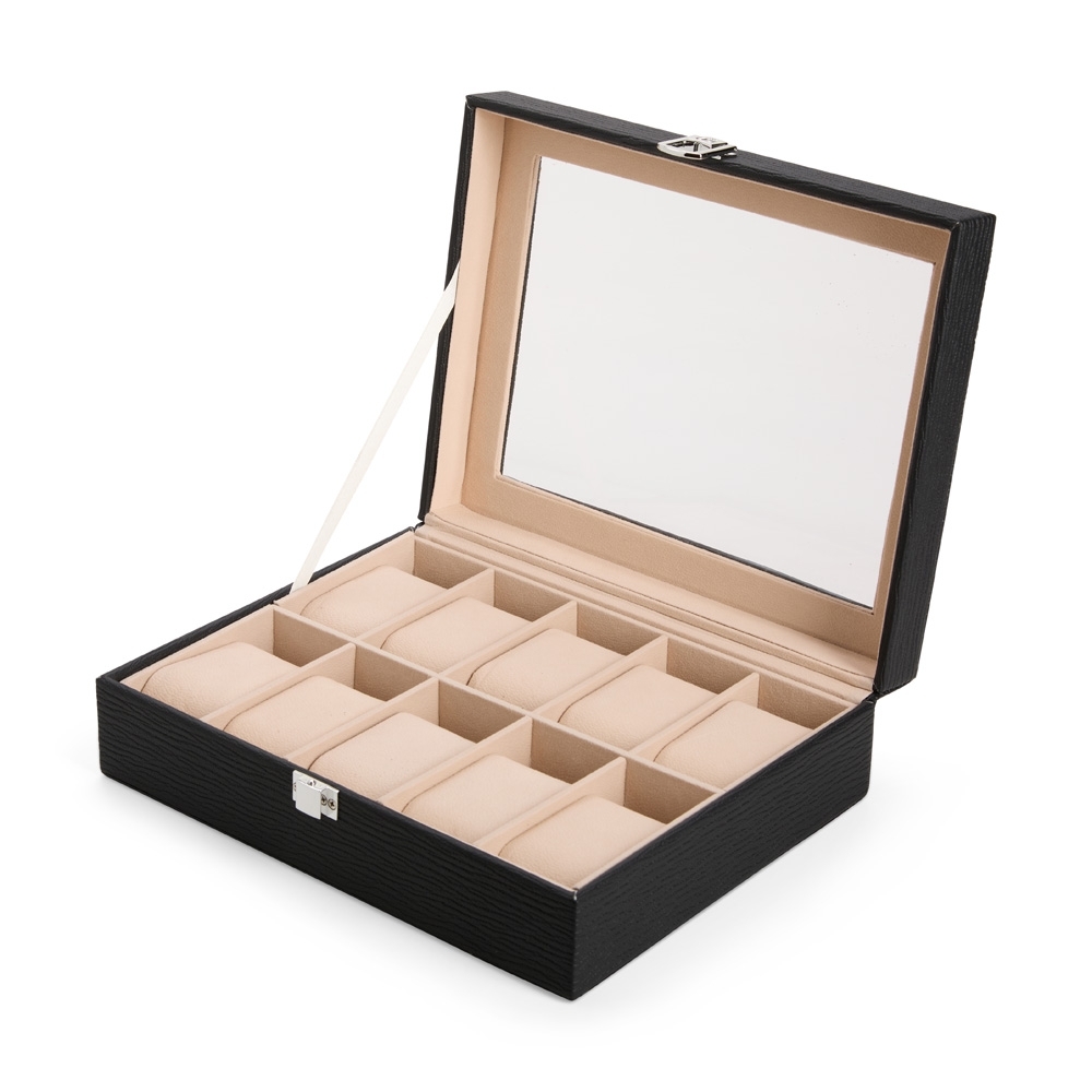 Descrição: Porta-relógios com acabamento texturizado em couro sintético à base de PVC e revestimento interno em tecido aveludado. Possui dez divisórias com almofadas removíveis, visor de vidro e trava de segurança na tampa.