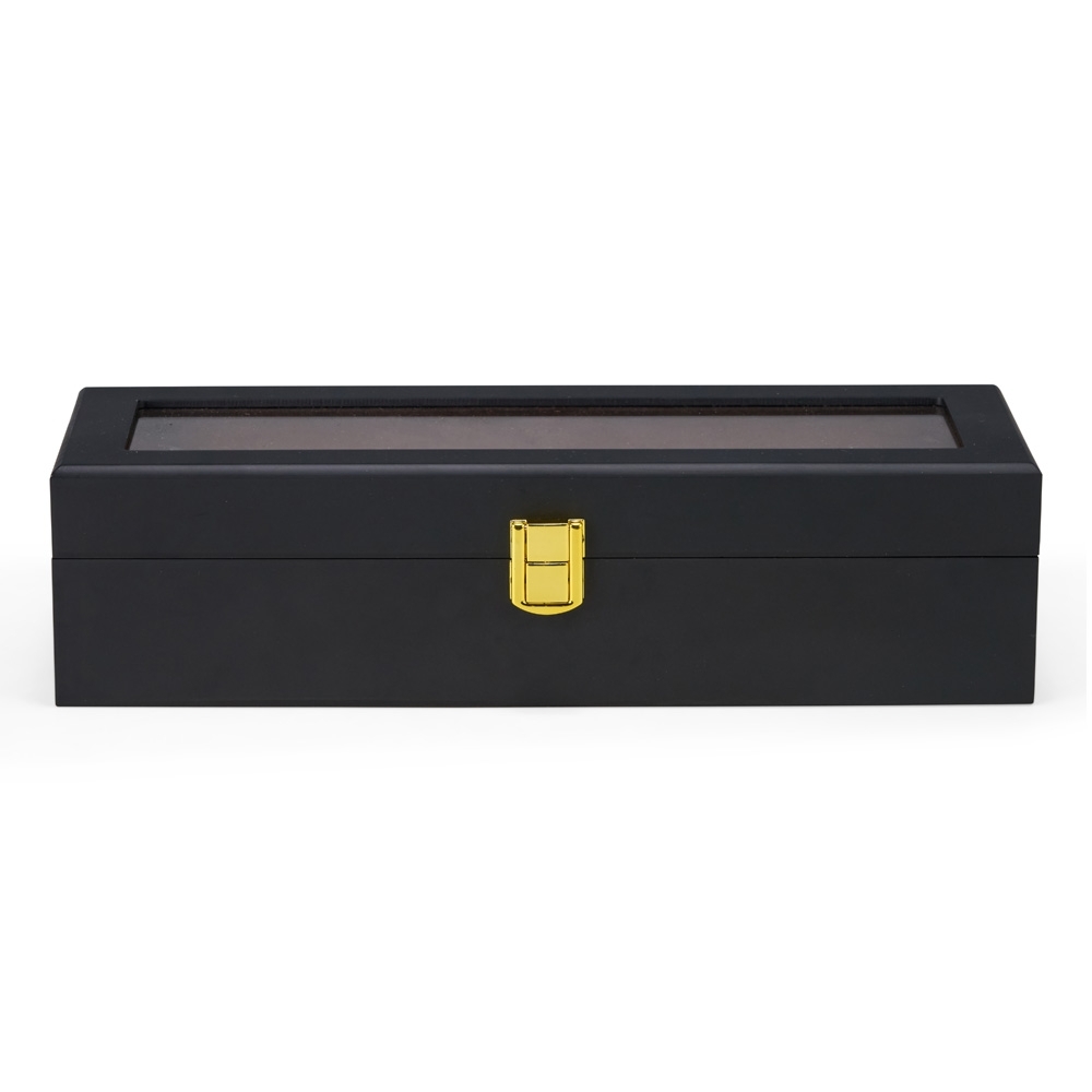 Descrição: Porta-relógios feito em MDF de acabamento laqueado e revestimento interno em tecido peluciado. Possui seis divisórias com almofadas removíveis, visor em vidro e trava de segurança para fechamento da tampa.