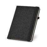 Caderno A5 em canvas com capa dura, 96 folhas lisas, fita separadora, elástico e suporte para esferográfica.
