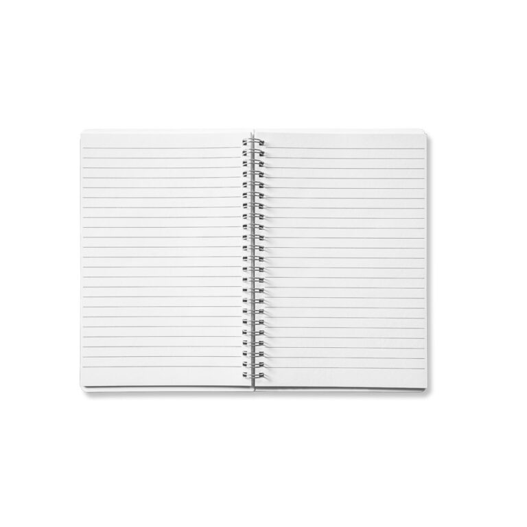 Caderno A5 personalizado com 80 folhas pautadas em papel reciclado.