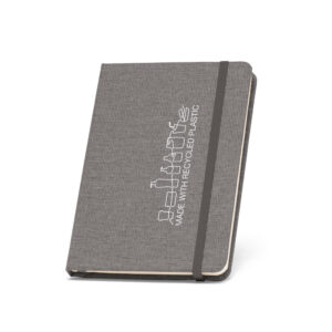 Caderno B6 personalizado capa dura com suporte para caneta, bolso interior e 80 folhas lisas em cor marfim.