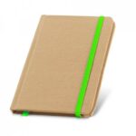 Caderno ecológico personalizado de capa dura em cartão, elástico e fita separadora.