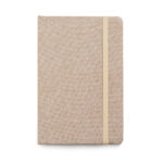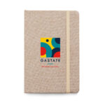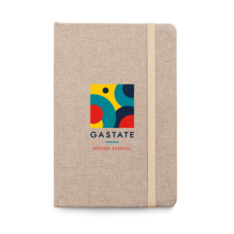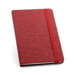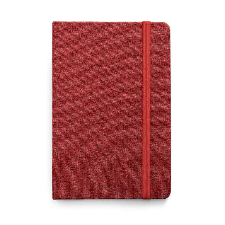 Caderno personalizado A5 com capa dura, 80 folhas pautadas e elástico.
