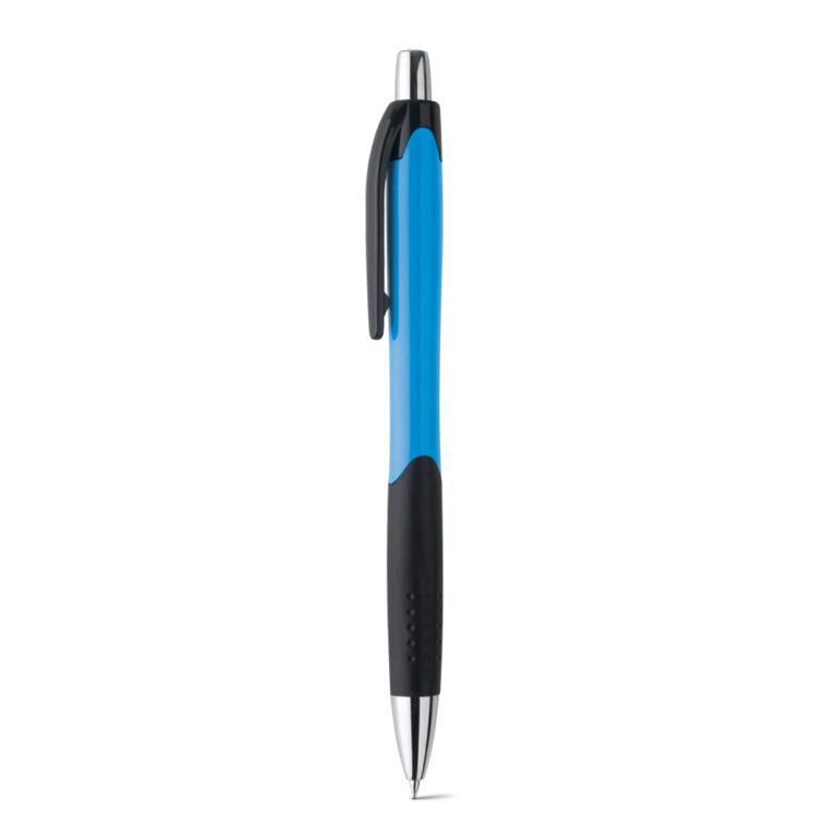 Caneta Plástica com acabamento brilhante e ponteira cromada. Até 1,5 km de escrita.