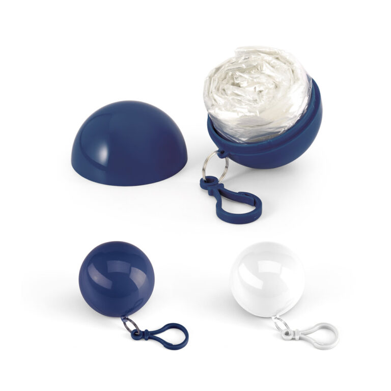 Capa de chuva em formato de bola com chaveiro e mosquetão. Personalize com logo ou arte preferida e proteja-se!