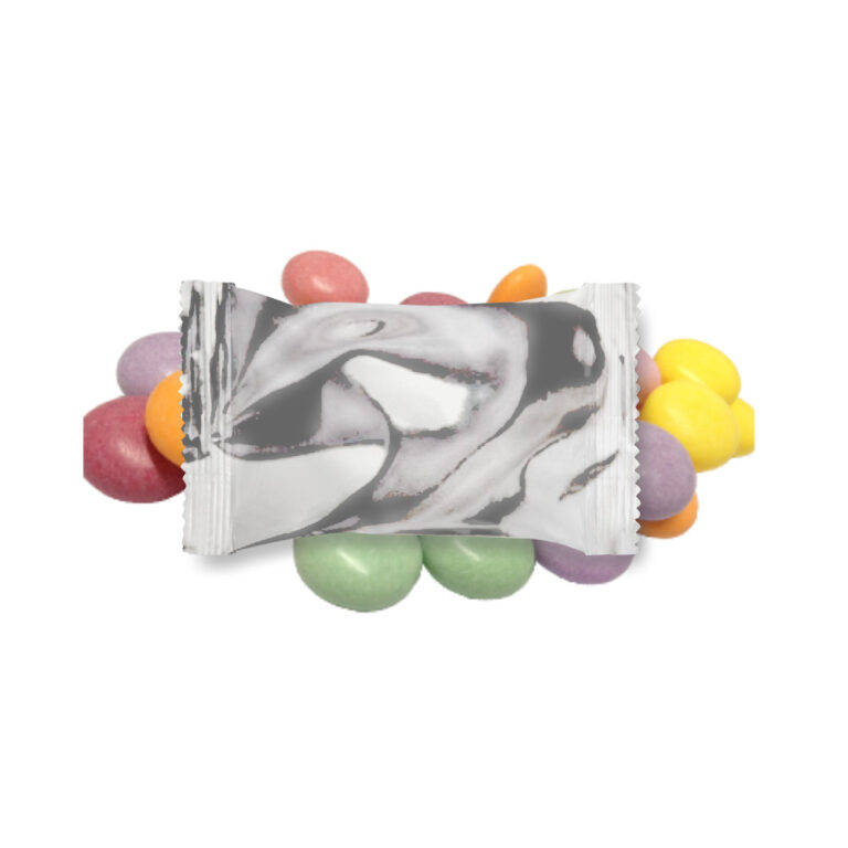 Drops mastigáveis personalizados com sabor de frutas sortidas.