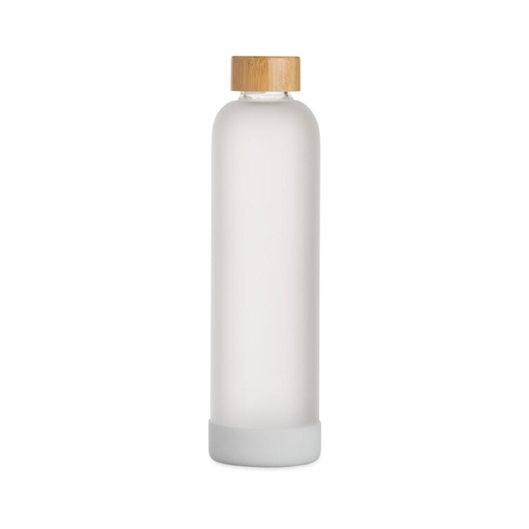 Garrafa de vidro de 1L com tampa de bambu, base de silicone e design elegante. Personalize e desfrute de suas bebidas favoritas com estilo e sustentabilidade! Faça um orçamento conosco!