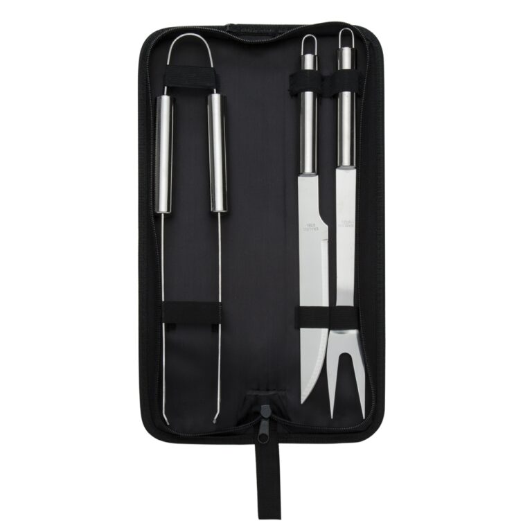 Kit churrasco personalizado 3 peças com faca, garfo, pegador, estojo e plaqueta para gravação.