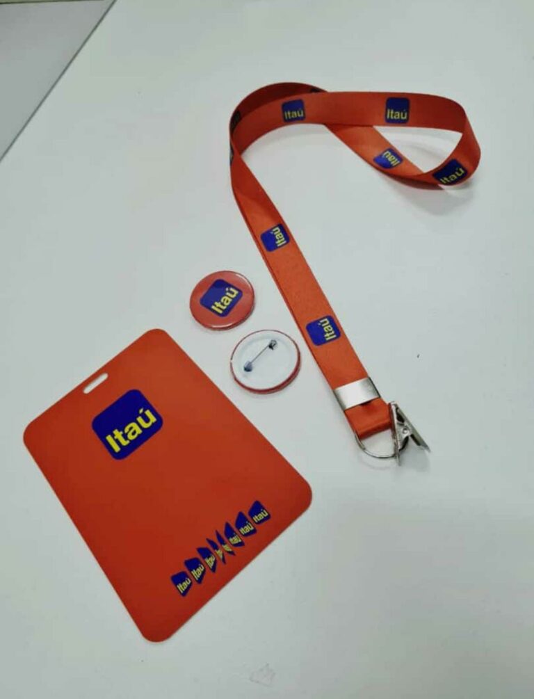 Kit completo com crachá, cordão ajustável e bottom personalizáveis.