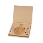 Kit queijo personalizado 3 peças em estojo kraft com tábua redonda, garfo e espátula.