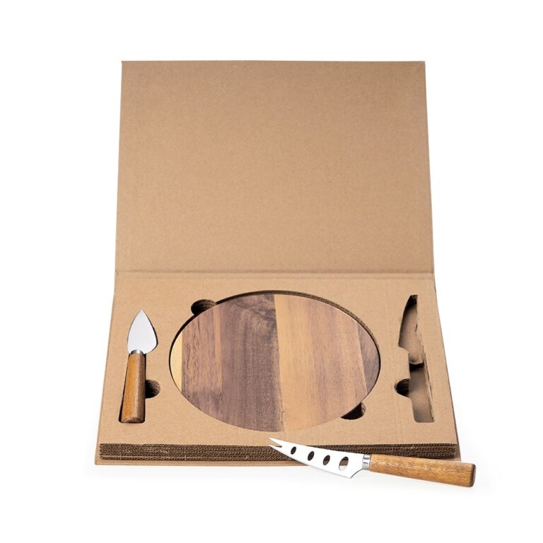 Kit queijo personalizado 3 peças em estojo kraft com tábua redonda, faca ponta e faca vazada.