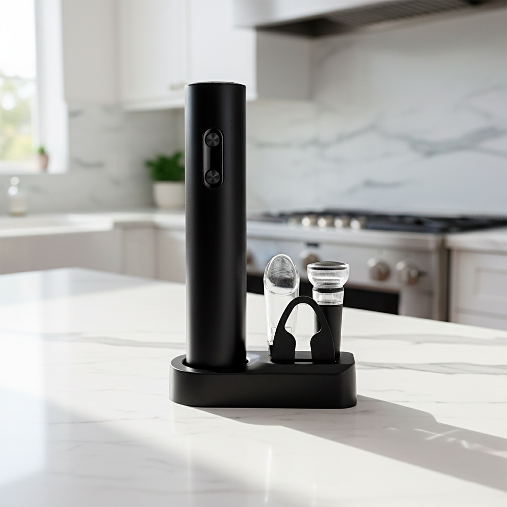 Descrição: Kit vinho com cinco peças, incluindo: saca-rolhas em plástico e aço carbono com acionamento por botões alimentado por quatro pilhas AA (não inclusas), bico dosador e rolha em plástico e borracha TPR, cortador de lacre e base em plástico. Altura : 22,5 cm Largura : 4,5 cm Circunferência : 14 cm Medidas aproximadas para gravação (CxL): 14 cm