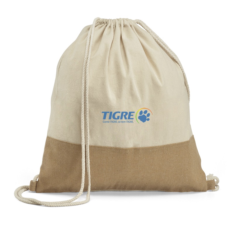 Mochila saco para brindes, personalizada em silk ou transfer. Confeccionado em algodão com detalhe em juta, modelo na cor cru, é o brinde ideal para fidelizar clientes e colaboradores. Consulte a Zimi.