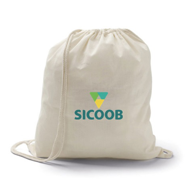 Mochila saco para brindes, personalizada em silk ou transfer. Confeccionado em algodão, modelo na cor cru, é o brinde ideal para fidelizar clientes e colaboradores. Consulte a Zimi.