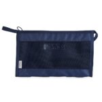 Necessaire personalizada em poliéster com alça lateral, compartimento principal superior e outro frontal.