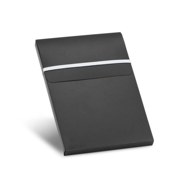Conjunto de caderno A5 e esferográfica. O caderno de capa dura em c. sintético contém 160 páginas lisas, fita separadora e elástico para fecho do bloco. A esferográfica tem escrita em azul. Fornecido com caixa presente em PP com elástico