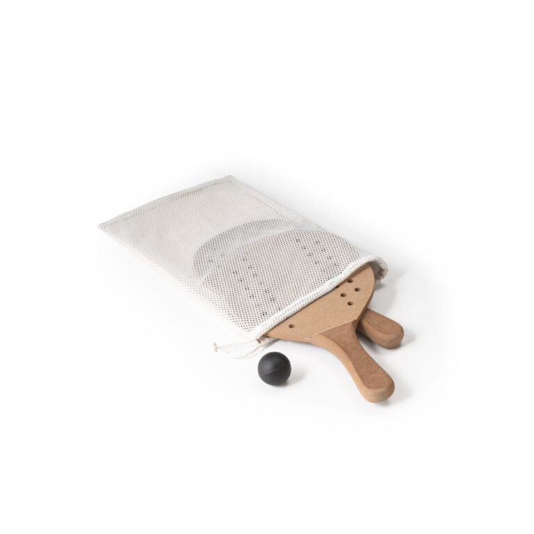 Raquetes de praia em MDF com bola inclusa. Fornecidas individualmente num saco em 100% algodão. 330 x 190 x 8 mm