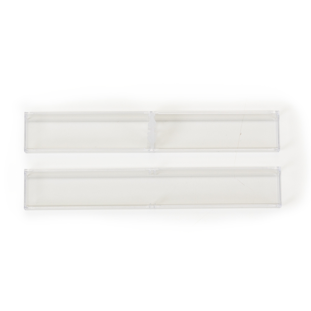 Descrição: Tubo de acrílico retangular, há uma espécie de “anel” central emborrachado para sustentar/encaixar a caneta. OBS.: PEDIDO APENAS MÚLTIPLO DE 50 PEÇAS!