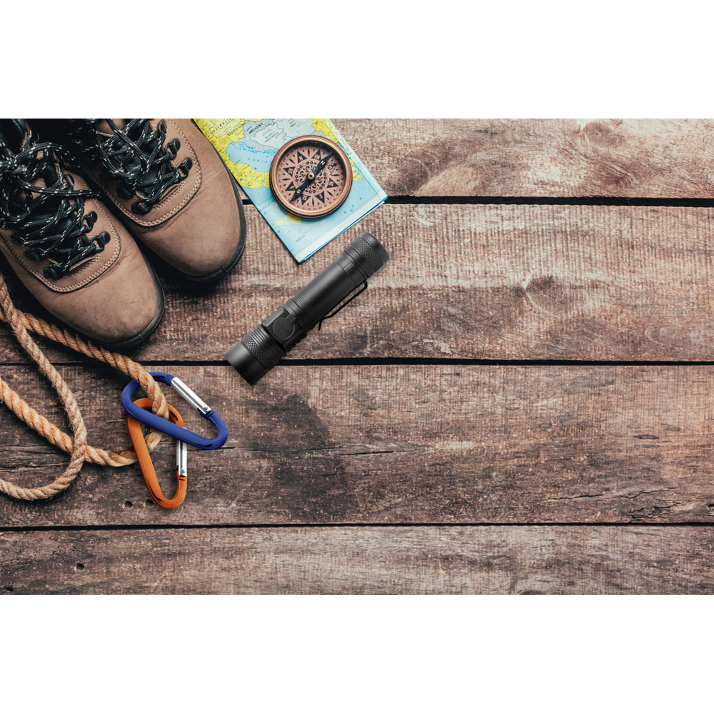 Lanterna recarregável de 5W em alumínio. A lanterna tem funcionalidades distintas como: LED com 300 lumens, 4 modos de iluminação, zoom telescópico e interruptor para ligar e desligar a lanterna. A bateria tem uma capacidade de 2.000 mAh, podendo ser recarregado com um cabo USB-C. Fornecido em caixa presente de papel kraft reciclado