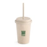 Copo de viagem em fibra de bambu (60%) e PP (40%) com tampa e canudo retráctil. Capacidade até 450 mL. Pode ocorrer transferência de calor. Certificação EU Food Grade