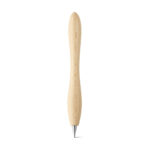 Esferográfica em madeira com tampa transparente. Escrita em azul. A cor e o resultado da impressão nos materiais naturais pode variar entre produtos