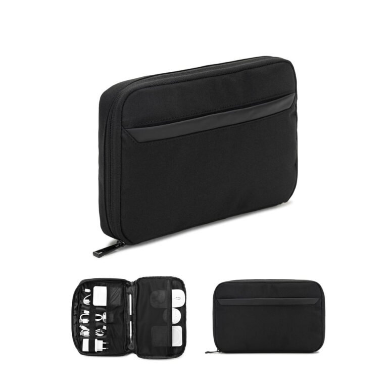 Bolsa organizadora espaçosa para acessórios tecnológicos. Composta por poliéster reciclado (rPET) 600D twill, com detalhes em PU e interior em poliéster reciclado (rPET) 210D. O compartimento principal contém vários bolsos para organizar todos os seus acessórios, cabos, carregadores e pequenos dispositivos em um só lugar