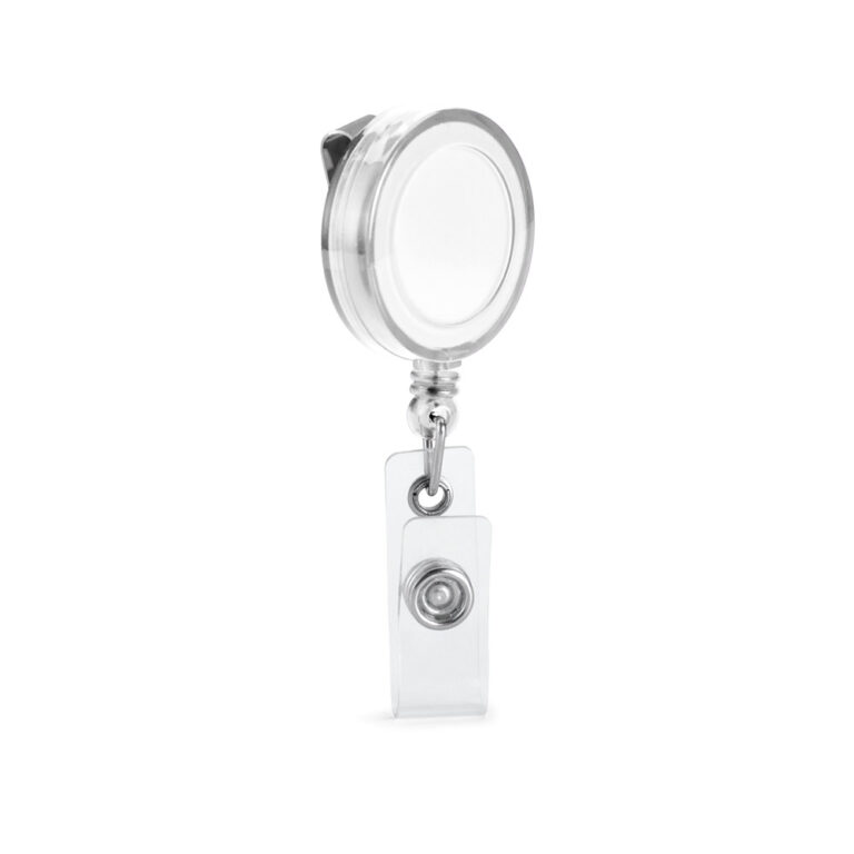 Porta crachá com clipe metálico com mecanismo extensível até aos 900 mm. Com presilha transparente e botão para adicionar bolsa porta-cartões. O mecanismo retrátil permite apresentar seu cartão ou credencial com segurança e comodidade. ø32 x 9 mm