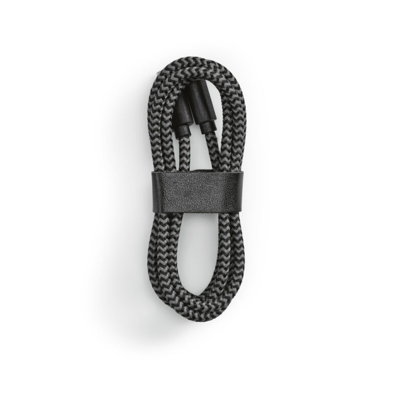 Cabo USB-C de carregamento rápido em PET 100% reciclado. Potência de entrada e saída de 3A. Incluso correia para organizar o cabo à sua maneira. Fornecido em caixa presente de papel kraft reciclado