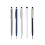 Esferográfica em alumínio com mecanismo twist, ponteira touch e clipe de metal. Escrita em azul até 1,5 km