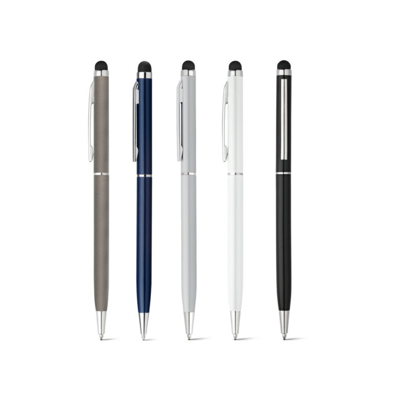 Esferográfica em alumínio com mecanismo twist, ponteira touch e clipe de metal. Escrita em azul até 1.5 km. ø8 x 135 mm