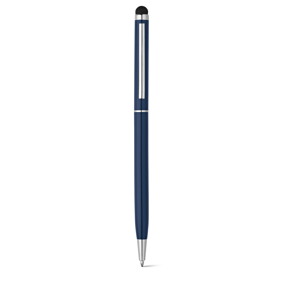Esferográfica em alumínio com mecanismo twist, ponteira touch e clipe de metal. Escrita em azul até 1.5 km. ø8 x 135 mm